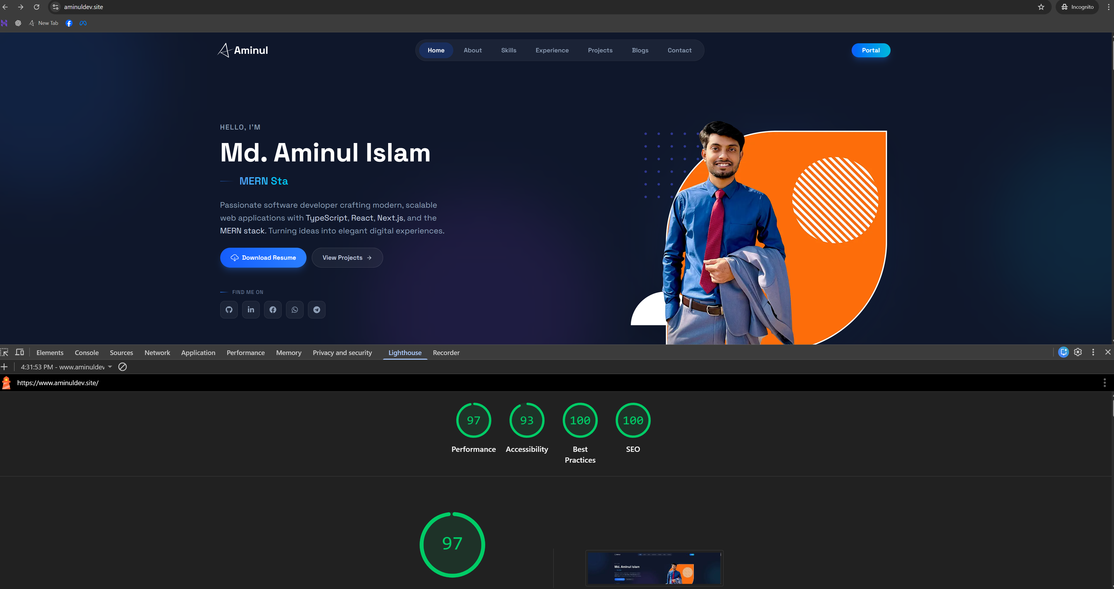 This project is a modern, high-performance personal portfolio website designed to professionally showcase my skills, projects, and technical expertise as a full-stack developer. The platform presents my work in a clean, structured, and engaging manner, combining strong visual design with optimized performance and SEO best practices. The website serves as both a personal brand platform and a professional resume—allowing recruiters, clients, and collaborators to easily explore my projects, technical stack, and contact information.